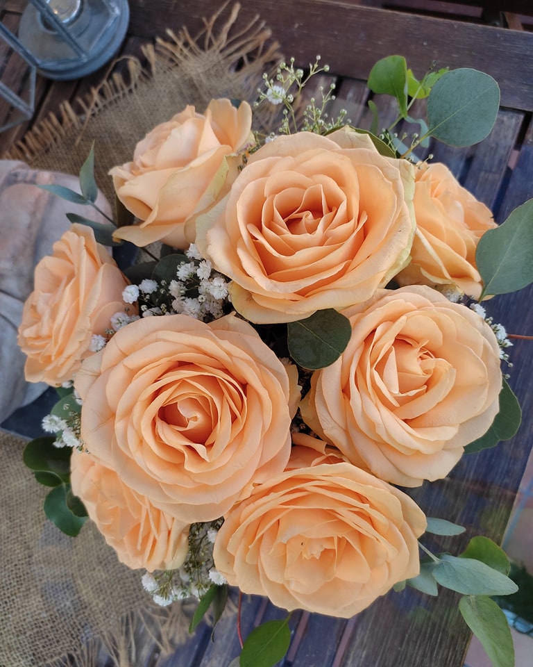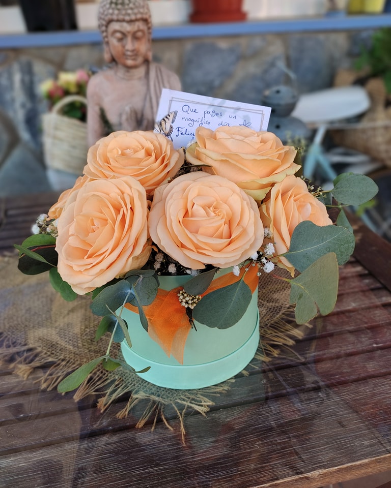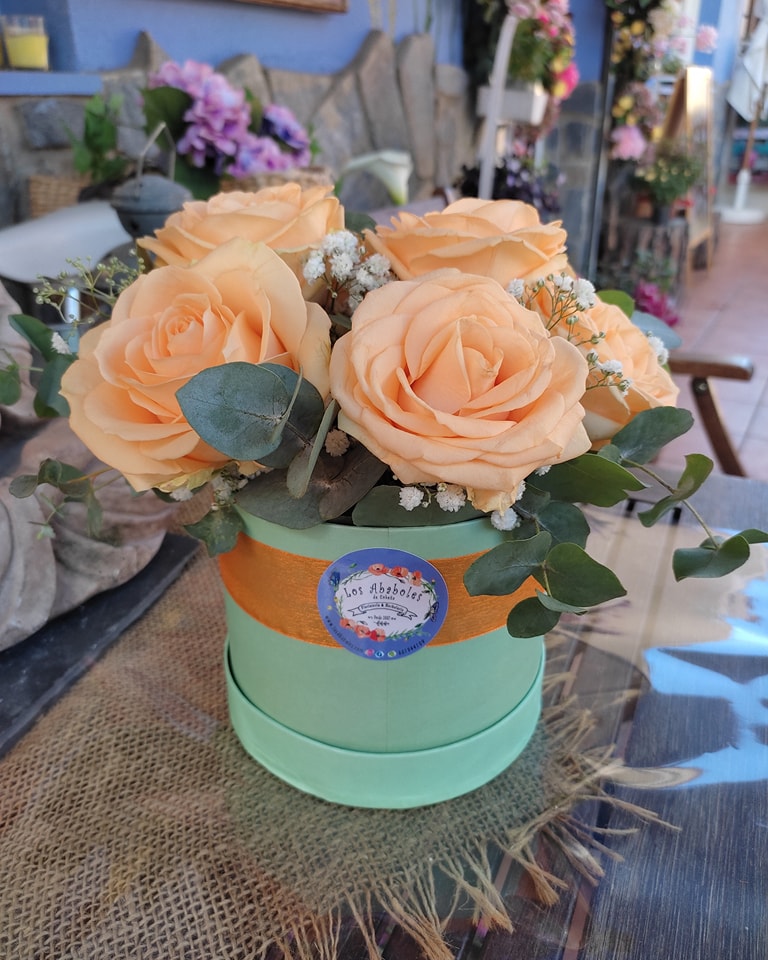 Bombonera color menta con rosas color salmón.