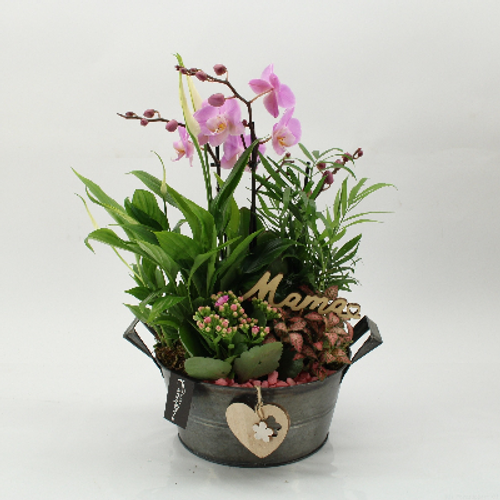 Centro de plantas en base de zinc, con letras «mamá»