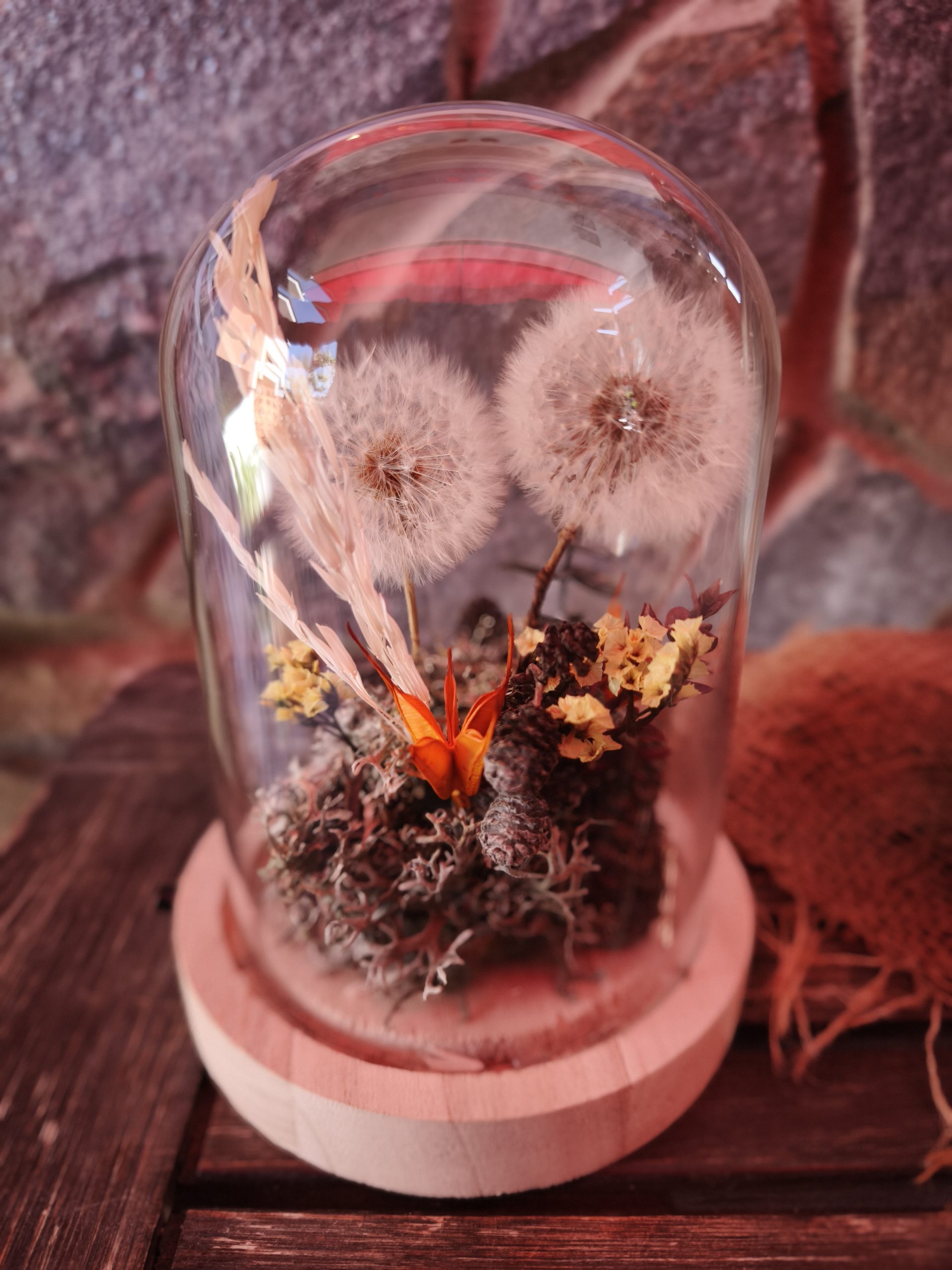 Hemos diseñado esta urna de cristal de forma artesanal, detalle a detalle, combinando la fragilidad de los dientes de león con flores preservadas y elementos naturales que se mantendrán intactos eternamente.