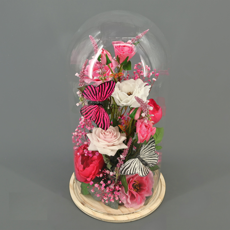 Presentado sobre base de madera y cúpula de cristal transparente. Es un regalo que gusta mucho a los amantes de las mariposas por la composición original y los materiales que están confeccionado.
