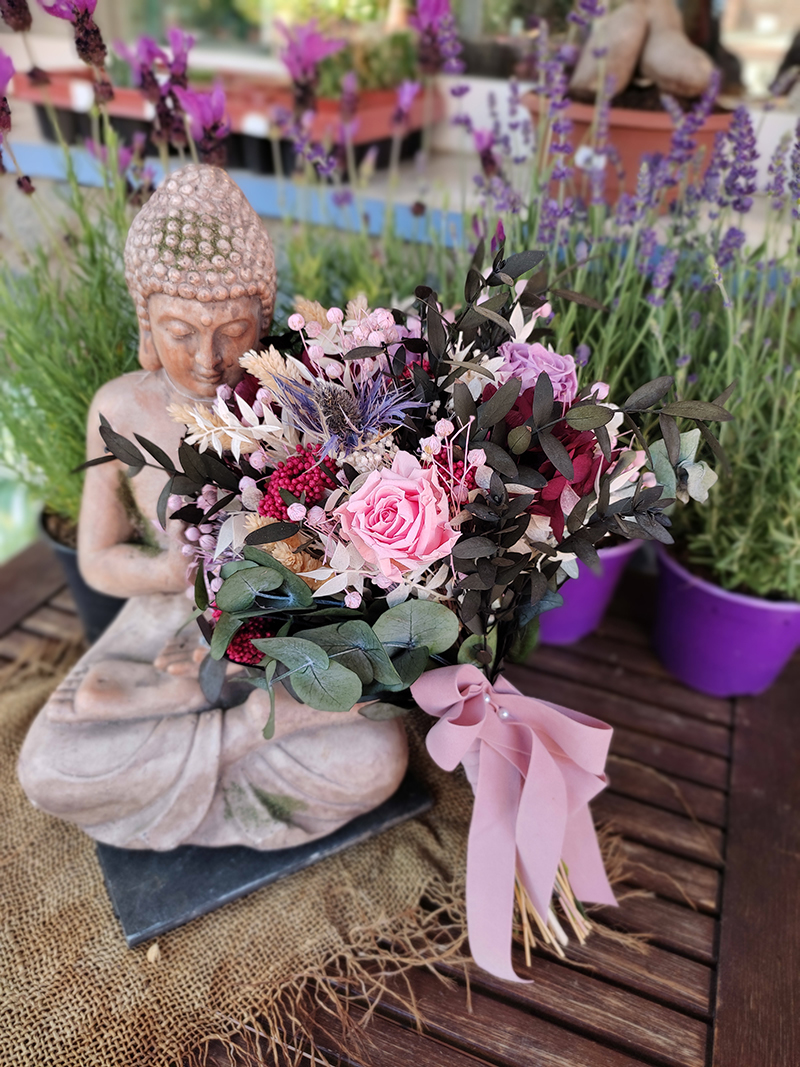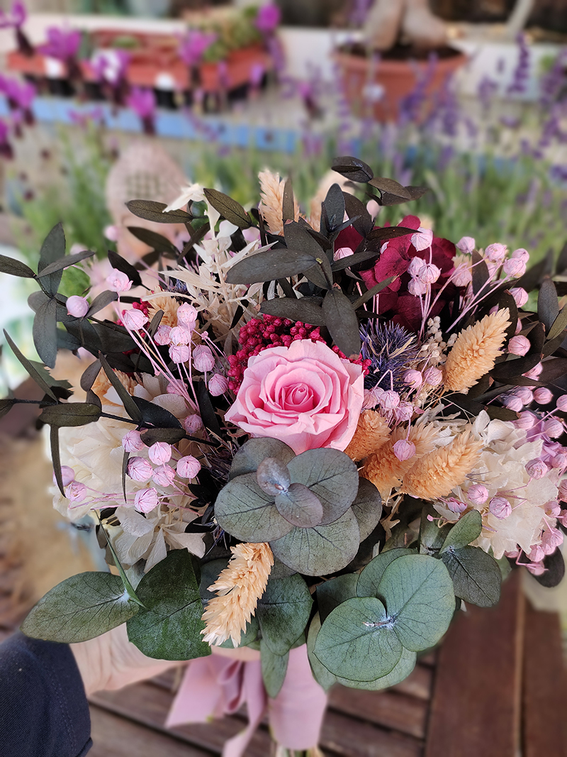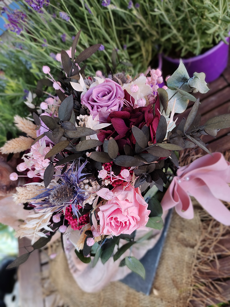 Ramo de Novia elaborado con flores preservadas y secas en tonos malva, rosa y burdeos.